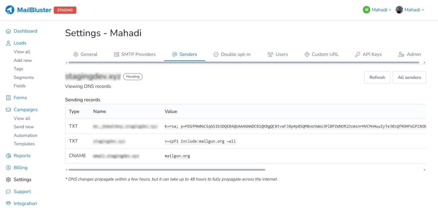 Now, you need to verify the DKIM and Return-Path values. Go to Settings → Senders on MailBluster and click the added domain.