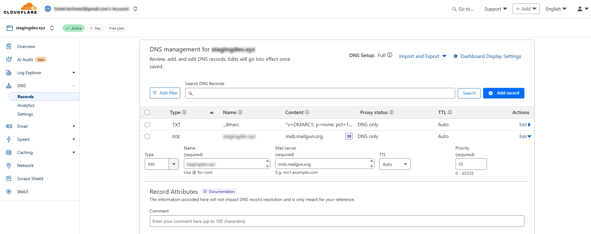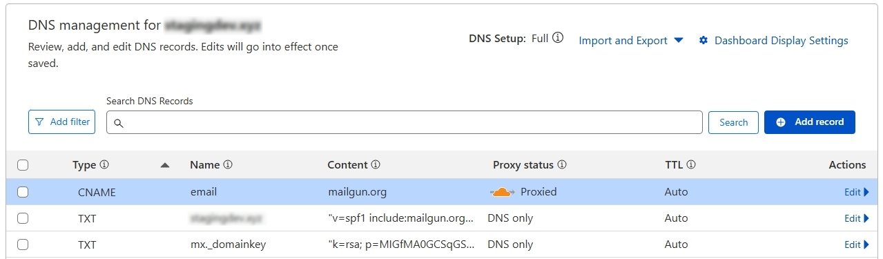 Mailgun’s DNS records are successfully inserted into the DNS management system.