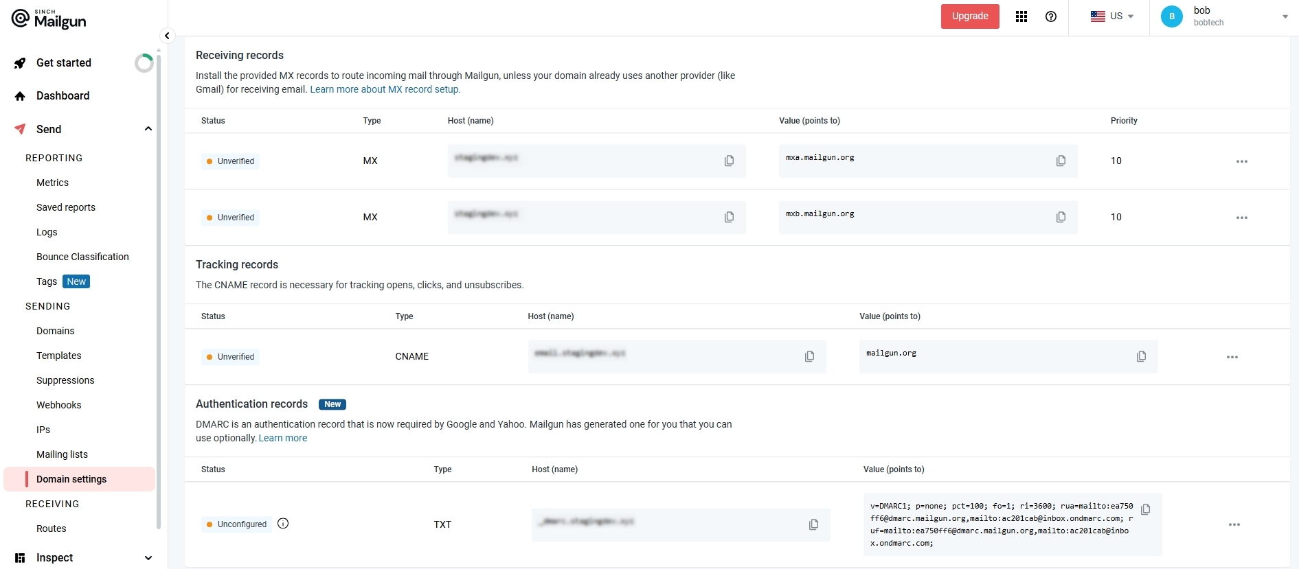 Now, go to Mailgun and select Send → Domain settings for the Receiving records, Tracking, and Authentication records.