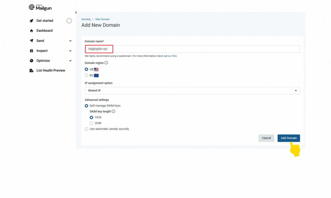 This will take you to the Add New Domain window. Type your Domain name, select Domain region, IP assignment option, and keep the Advanced settings the same as it is.