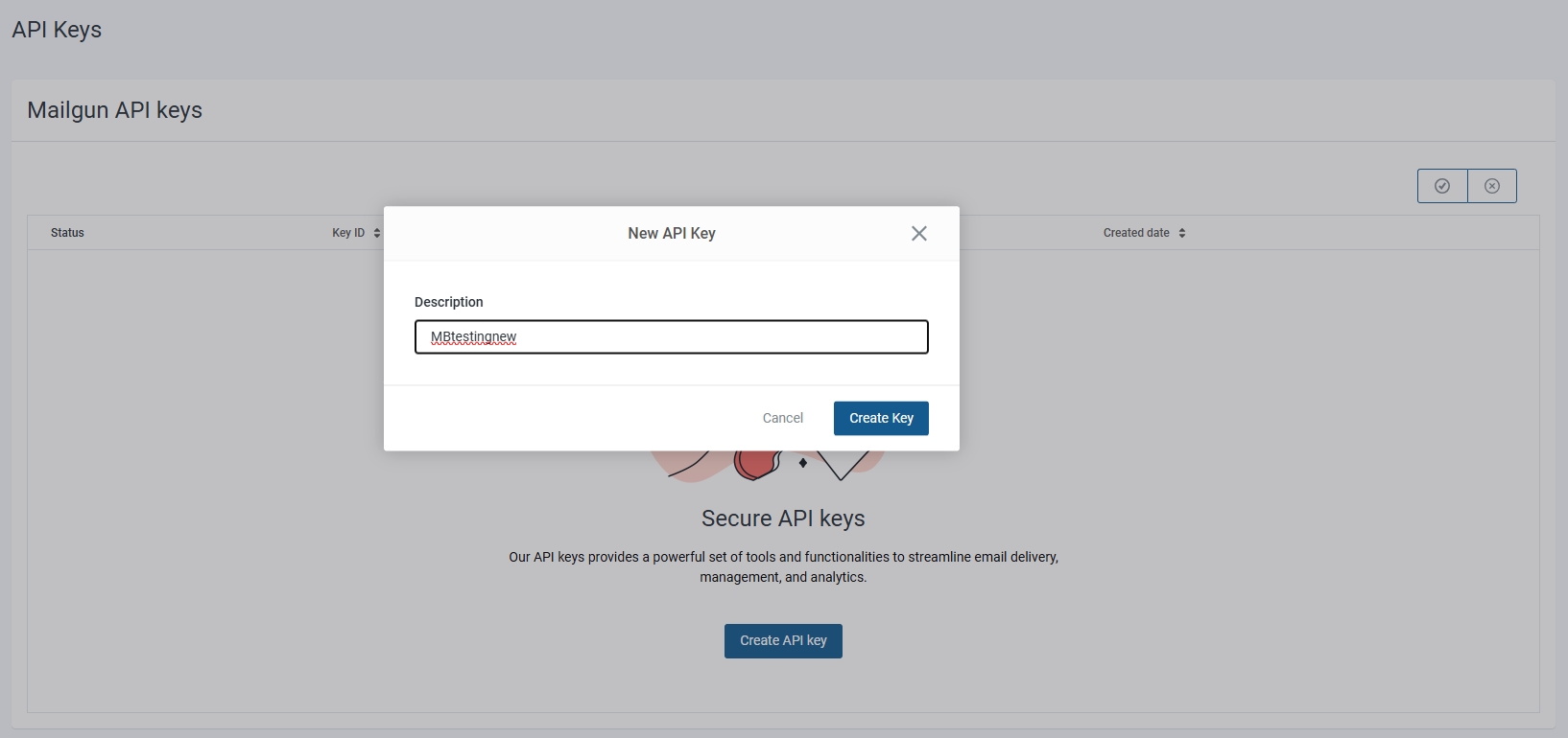 On the API Keys page, click Create API Key, and a pop-up window will appear.