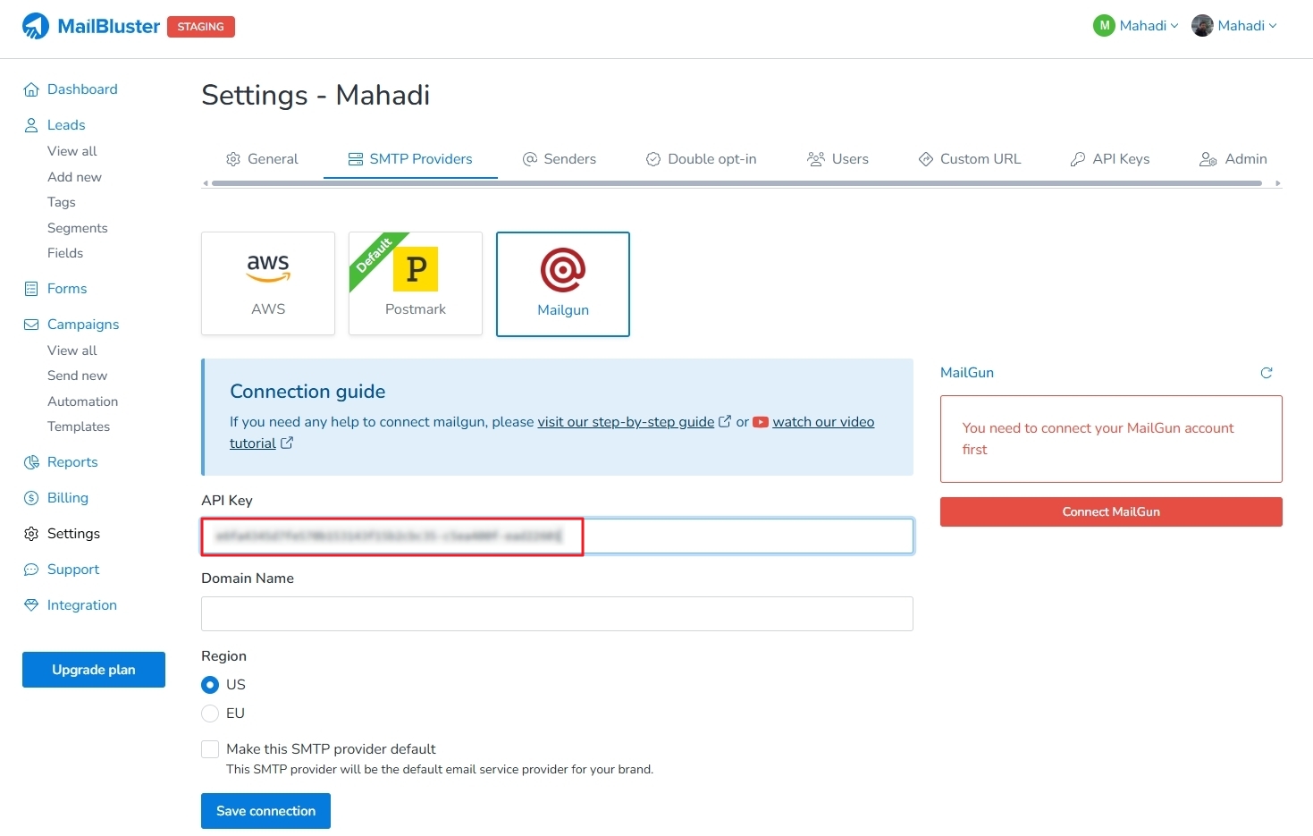 Now, let’s head to connect MailBluster with Mailgun this time.