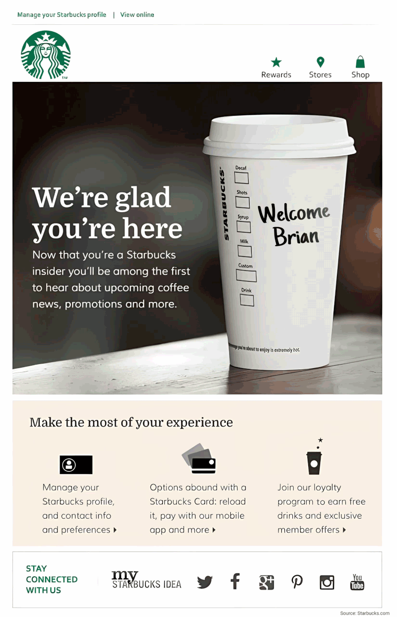 Starbucks, a retail coffee and roaster brand, sends individualized offers based on order history and visit frequency.