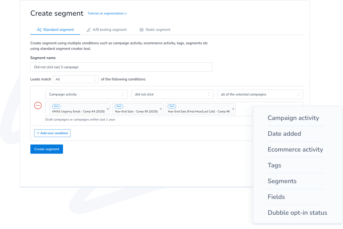 A Standard Segment is a dynamic list that automatically updates based on rules you set. For example, you can create a segment of contacts who "opened a specific campaign but did not click a link." The list changes in real-time as contacts meet (or no longer meet) the conditions.