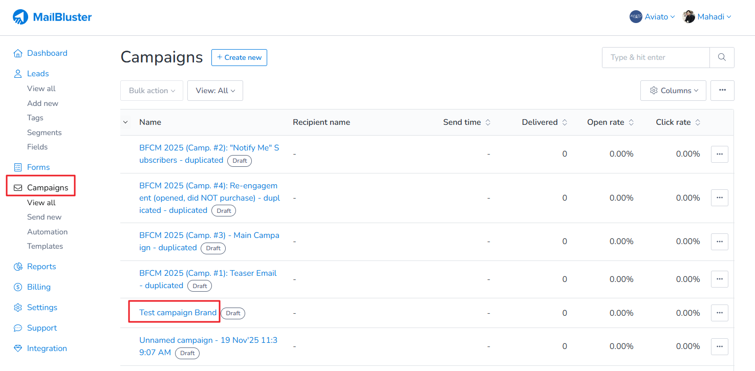 You can easily create and send an email campaign in MailBluster by following a few simple steps. First, go to your Brand > Campaigns and the click on Create new.